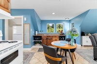 Inside you will find a freshly designed suite with lush linens, and luxuriously comfortable bed recliner armchairs a coffee bar table for two and a modest kitchen.